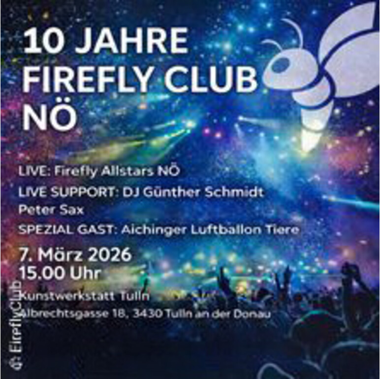 Am 7. März 2026 verwandelt sich die Kunstwerkstatt Tulln wieder in einen Ort voller Beats, Farben und Begegnungen: Der FireflyClub lädt ein zur großen Jubiläumsparty – 10 Jahre inklusive Clubkultur!