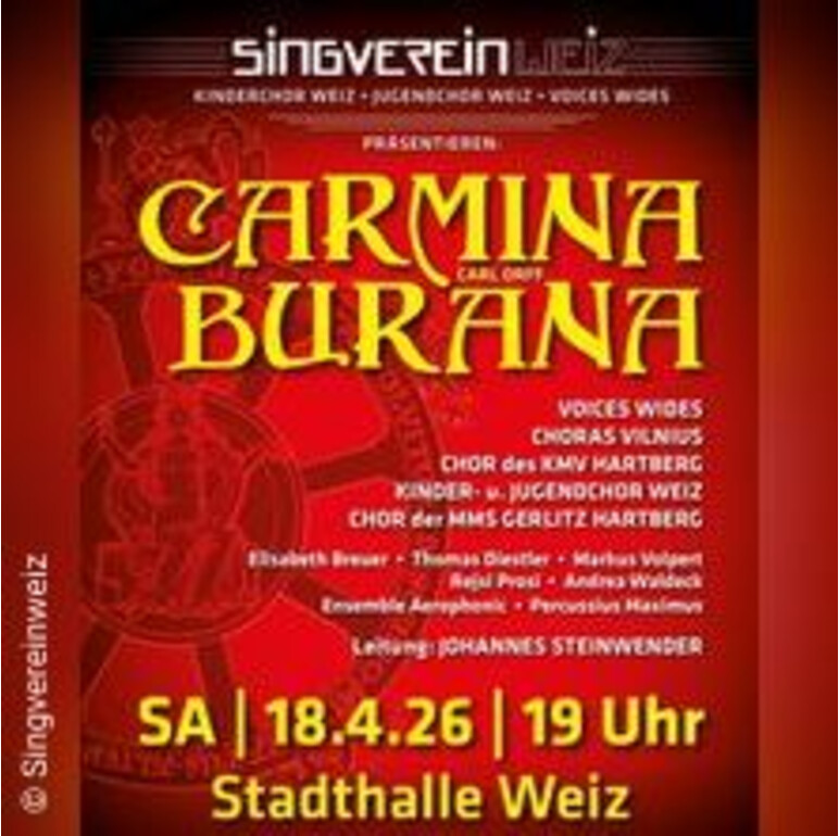 | Sa | 18.04.2026 | 19:00 Uhr | Stadthalle Weiz Dr.-Karl-Widdmann-Straße 50 8160 WEIZ Österreich zum Routenplaner | Carmina Burana | |