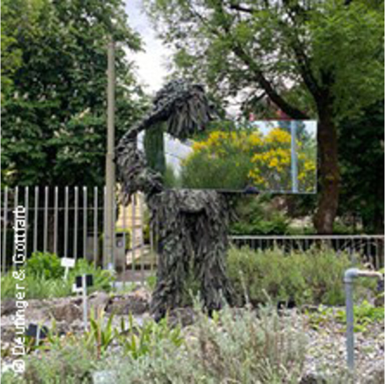 Zwei Tänzer in Tarnanzügen und mit tragbaren Spiegeln bewegen sich in einem feinen Spiel zwischen Sichtbarkeit und Verschwinden. Ausgangspunkt ihrer Recherche ist ein botanischer Garten – ein Ort, an dem sie das Paradox von Anpassung und Präsenz erkunden.