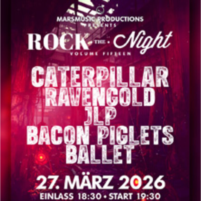 Der Headliner der 15. Ausgabe CATERPILLAR überzeugt mit purer und authentischer Rock Musik. Ebenso mit dabei sind die wunderbar vielfältig rockenden JLP, die verzaubernden RAVENGOLD, sowie die Hard-Rock Newcomer BACON PIGLETS und BALLET, welche den Abend mit kraftvollen und eingängigen Metal eröffnen werden.