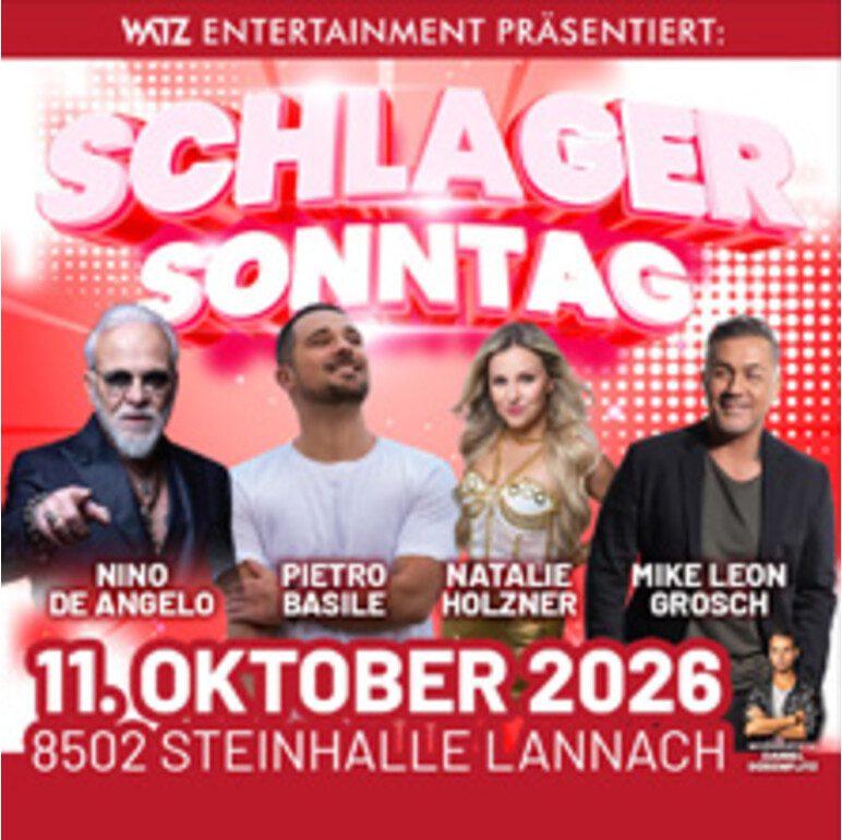Am Sonntag, 11. Oktober 2026, verwandelt sich die Steinhalle Lannach (8502) in einen Treffpunkt für alle Schlagerfans. Unter dem Motto "Schlager Sonntag" präsentiert WATZ Entertainment ein hochkarätig besetztes Live-Event mit bekannten Stars der deutschsprachigen Schlagerszene.