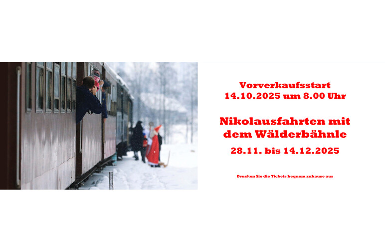 | Mo | 08.12.2025 | 13:00 Uhr | AUSVERKAUFT - Nikolausfahrt mit dem Wälderbähnle 2025 | |
